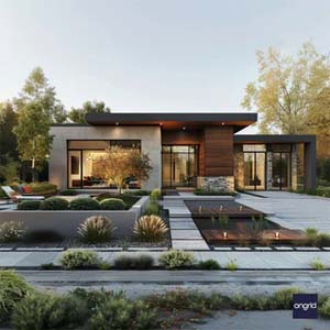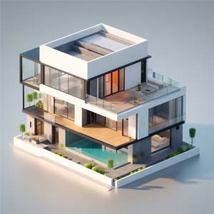 A clear depiction showcasing the three-dimensional appearance and features of a building from a specific viewpoint.